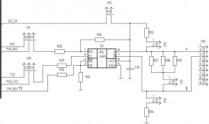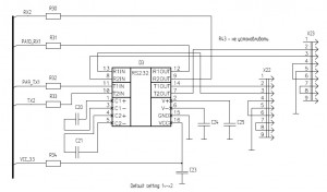 Преобразователь уровней сигнала для различных типов логики TTL/CMOS выполнен на специализированной микросхеме max3232c. Микросхема драйвера имеет два входных и два выходных канала для преобразования. Оба разъема X22 и X23 подключены к одной микросхеме драйвера, поэтому используются только две основные линии TxD и RxD для подключения к модулям USART1 и USART2 микроконтроллера.